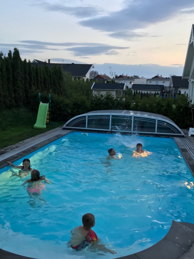 Premiärbad i grannarnas pool hann vi också med. Så härligt då man kan sitta ute på kvällarna utan att frysa ihjäl.