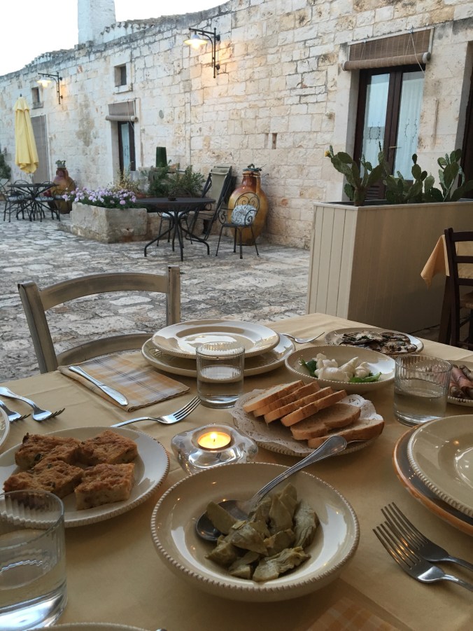 Familjen på Masseria Casina Vitale lagade även mat åt gästerna om man så önskade. De frågade om det var något vi inte åt. Nej, sa vi och vi fick en grym middag med många olika små rätter.
