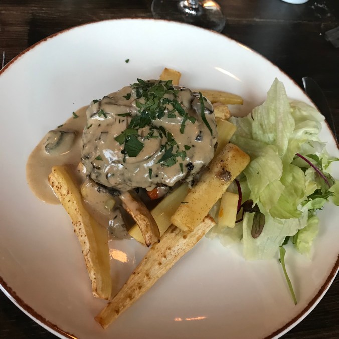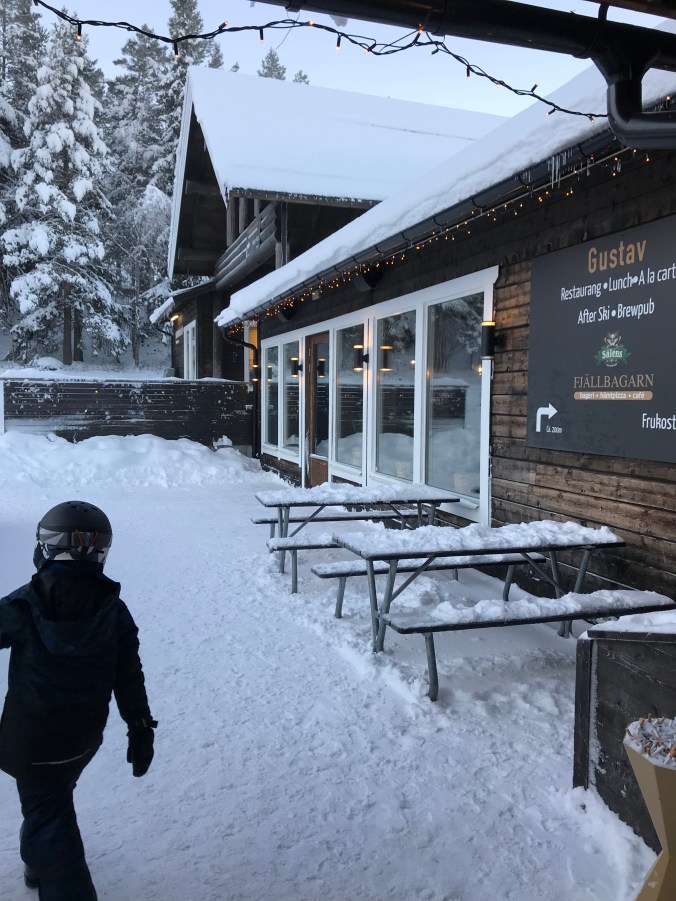Det blev en sen lunch på Gustav Grill & Bar. Dagens lunch var älgfärsbiff med svampsås och rotfrukter. Barnen åt gulaschsoppa och pannkakor. Så gott allting!