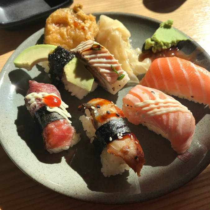 Vi hittade ett riktigt trevligt sushiställe nära järnvägsstationen där vi åt lunch på söndagen. De hade bland annat sushibuffé. Riktigt gott! Dottern slog ett rekord med 25 bitar, jisses! 😆