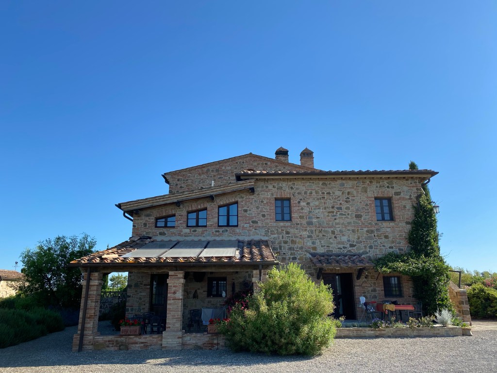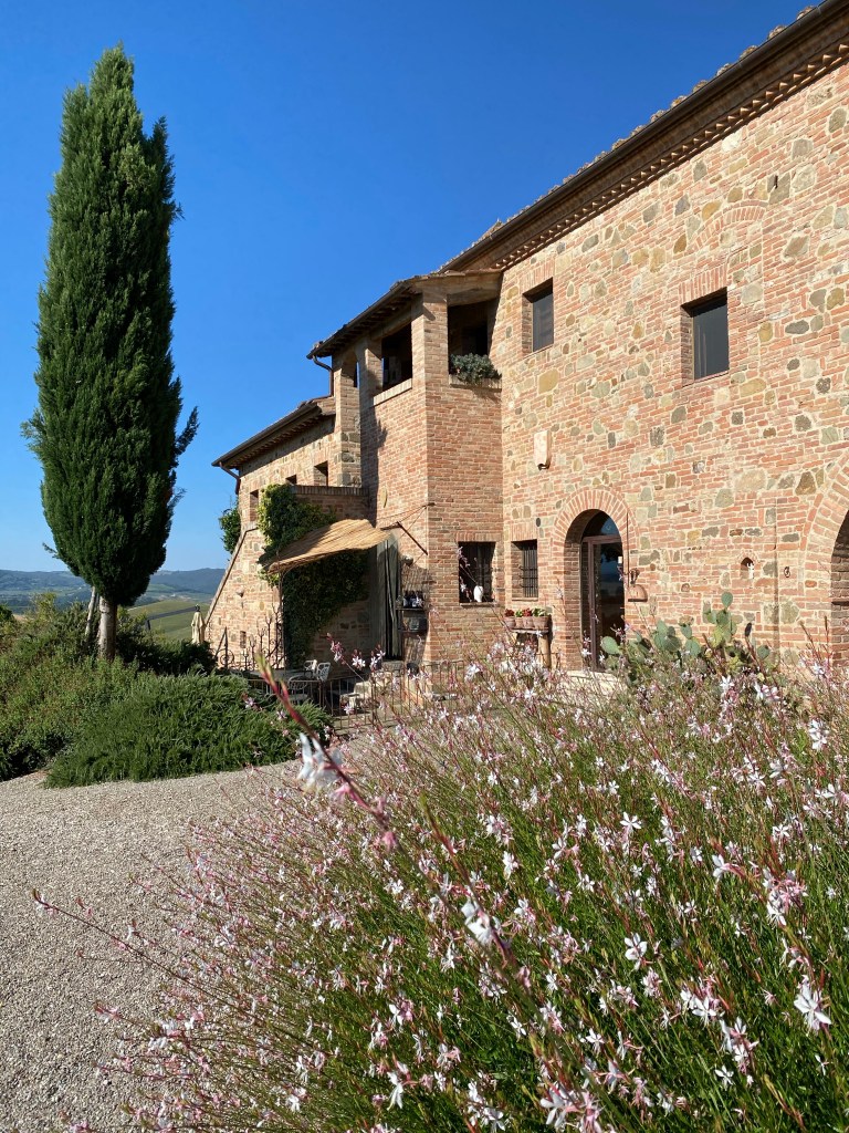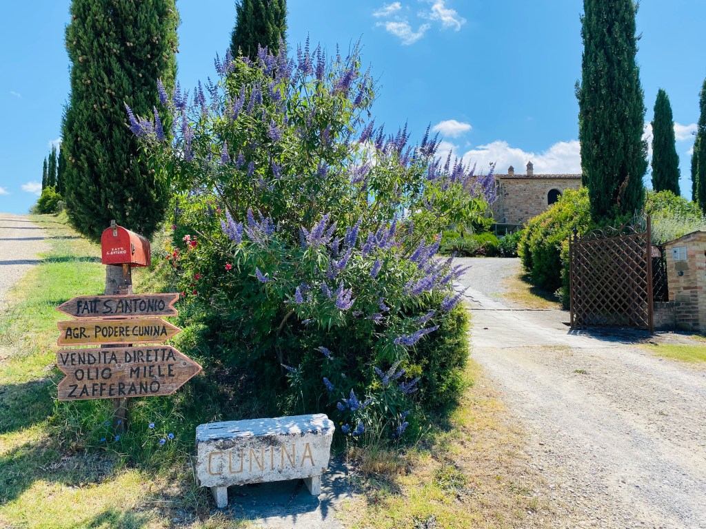 Det här är Podere Cunina och det är här vi bor under denna resa. Vi hyr en lägenhet i ett stort hus. Den mycket vänliga familjen som äger huset bor också här. Vi befinner oss nära byn Buonconvento i den södra delen av Toscana, ca 25 mil från Rom. Det här är ett riktigt drömställe mitt bland de gröna toskanska kullarna.