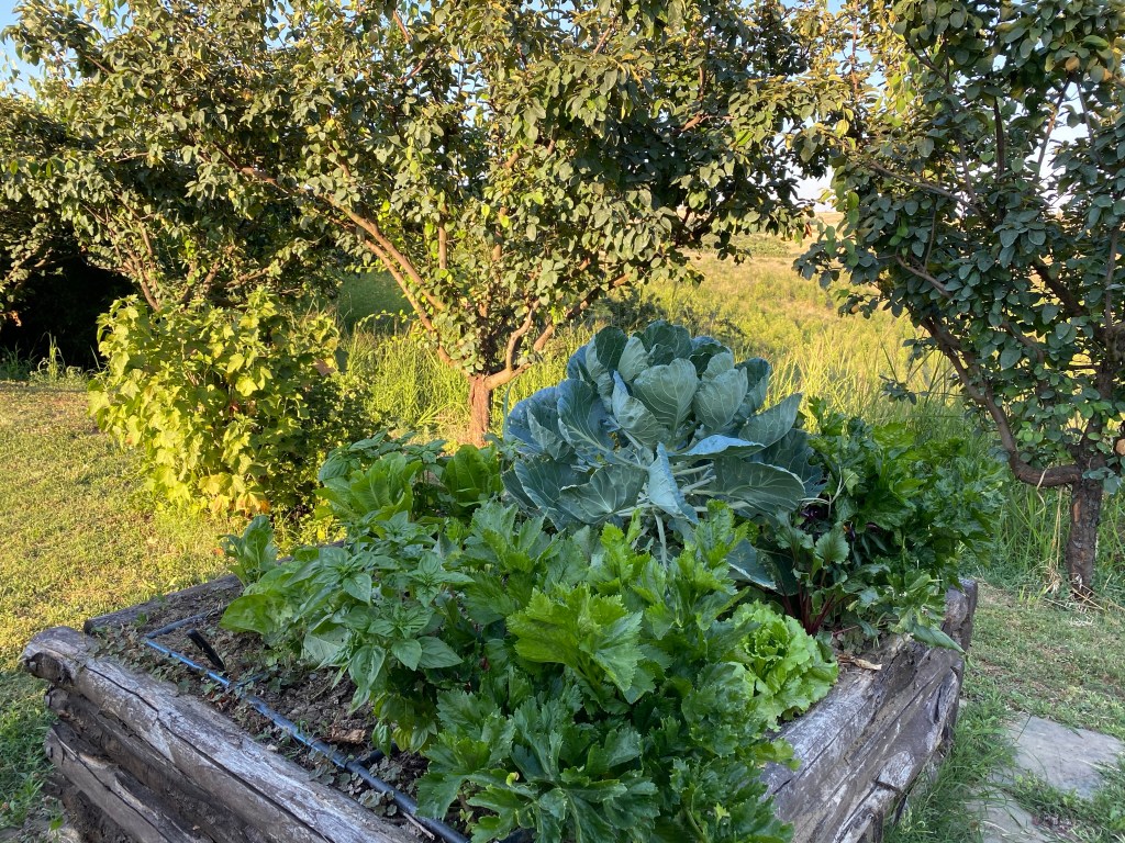 Det finns grönsaksodlingar och där får man gärna ta grönsaker till sin mat. Varje lägenhet har sin egen uteplats med bord och stolar.