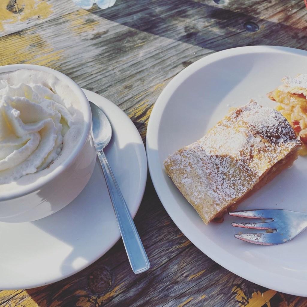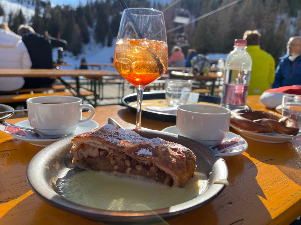 Vi klämde även in en eftermiddagsfika i Arabba. Detta ställe låg också mitt i backen. Godaste apfelstrudeln! Såklart med en Aperol till.