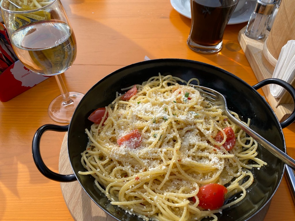 Vi sladdade in på denna restaurang som låg bra till för en lunchpaus. Pasta aglio och ett kallt glas vitt – vem kan klaga på blåst då?