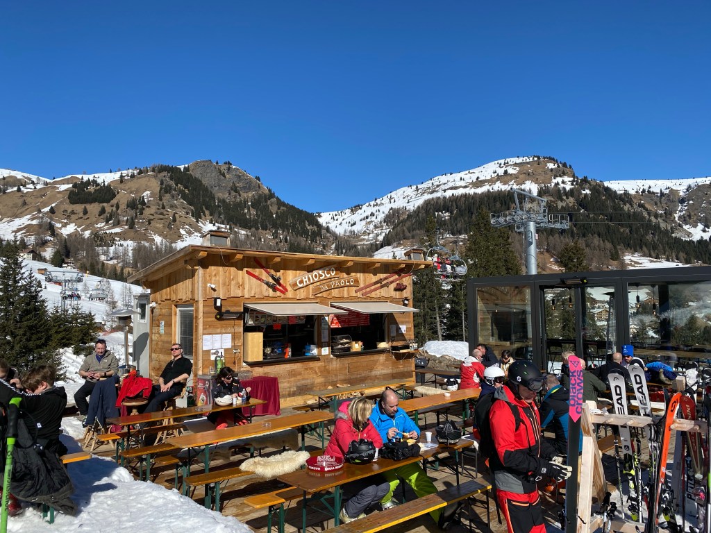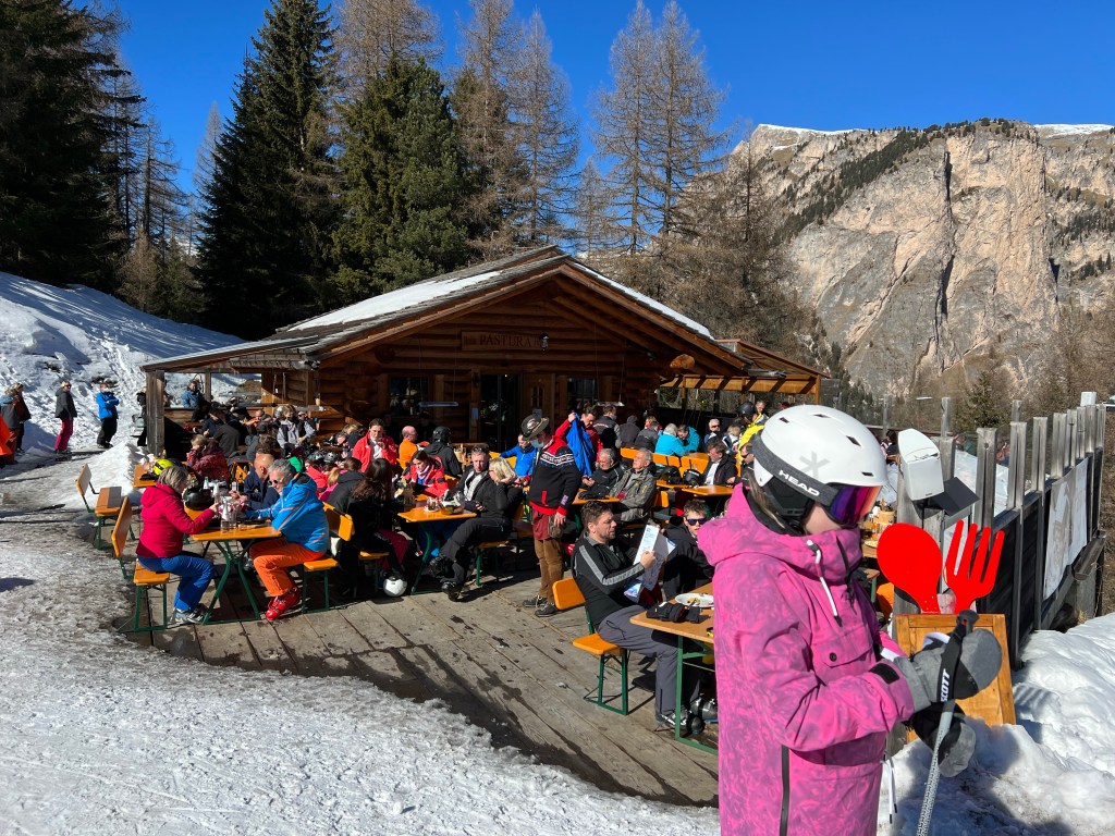 Första skiddagen styrde vi skidorna mot Arabba. Fantastiska vyer, klarblå himmel strålande sol och skönt väder bjöds vi på. Lunchställen finns det som sagt gott om och i Arabba hittar man en supertrevlig liten restaurang (mer lik en liten kiosk) med bra utbud av lunch och fika. Perfekt solläge och mitt i backen!