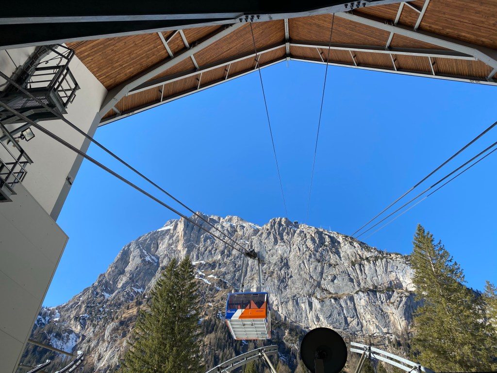 Efter att ha åkt den längsta backen ner behöver man sedan ta kabinbanan för att komma tillbaka på rätt sida av bergen. Högt upp är det, jag vågade inte titta ner förrän vi kommit fram.