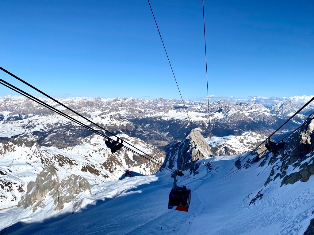 Åker man skidor i Dolomiterna bör man ta sig till den högsta punkten – berget Marmolada. Skidsystemet är ju enormt stor och otroligt bra utbyggt så vi tog oss på skidor från Canazei till Marmolada. Det blev en heldagsutflykt med ett kortare lunchstopp. När man är framme vid Marmolada behöver man ta tre Kabinbanor för att komma högst upp.