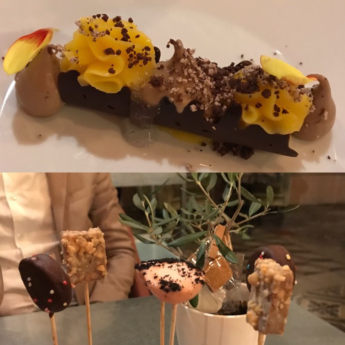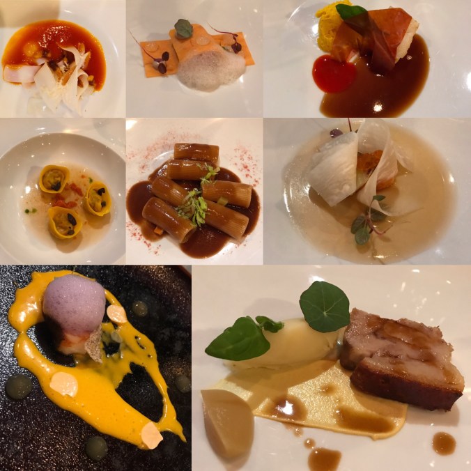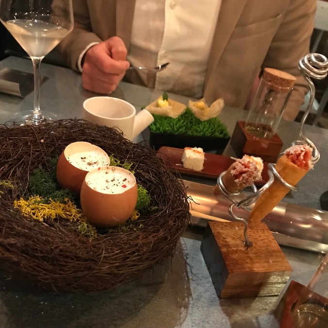 Innan maten fick vi detta (på bild nedan). Det var smaker av Italien; äggen smakade carbonara, strutarna spaghetti bolognese, ostarna – ost, och det sista minns jag inte men gott vart det. Restaurangen har en Michelin stjärna och såklart är det en upplevelse i sig att äta där. Personalen stod i givakt och var snabba på att sopa smulor från bordet och vika våra servetterna. 😅