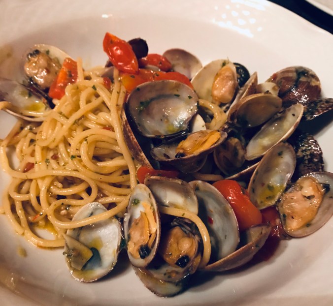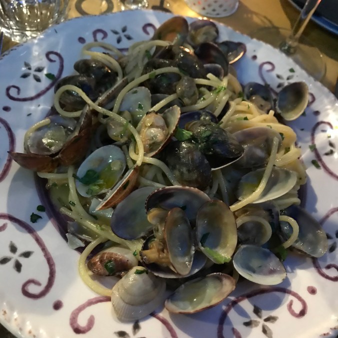 Första kvällen var vi ca en timme sena till vår bokade restaurang, Il Restoro dal Patriota, eftersom flyget blev försenat. Men det löste sig bra ändå. Det var god mat men stora portioner. Det blev bland annat kallskuret och pasta vongole. Vid midnatt då vi ätit klart stod både ögonen och magarna i kors.