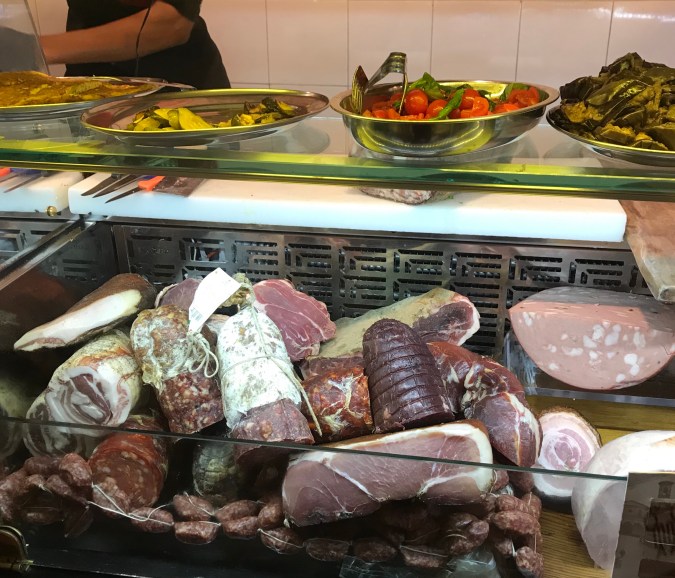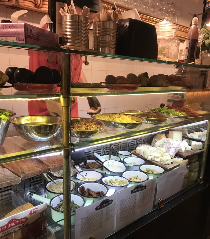 Lunchen på fredagen intogs också i närheten av vårt hotell på en prosciutteria. Ett litet och trångt ställe med några få bord. De flesta köpte med sig mat därifrån. Så galet gott allting! Vi delade på en plockbricka. Ett riktigt toppenställe!