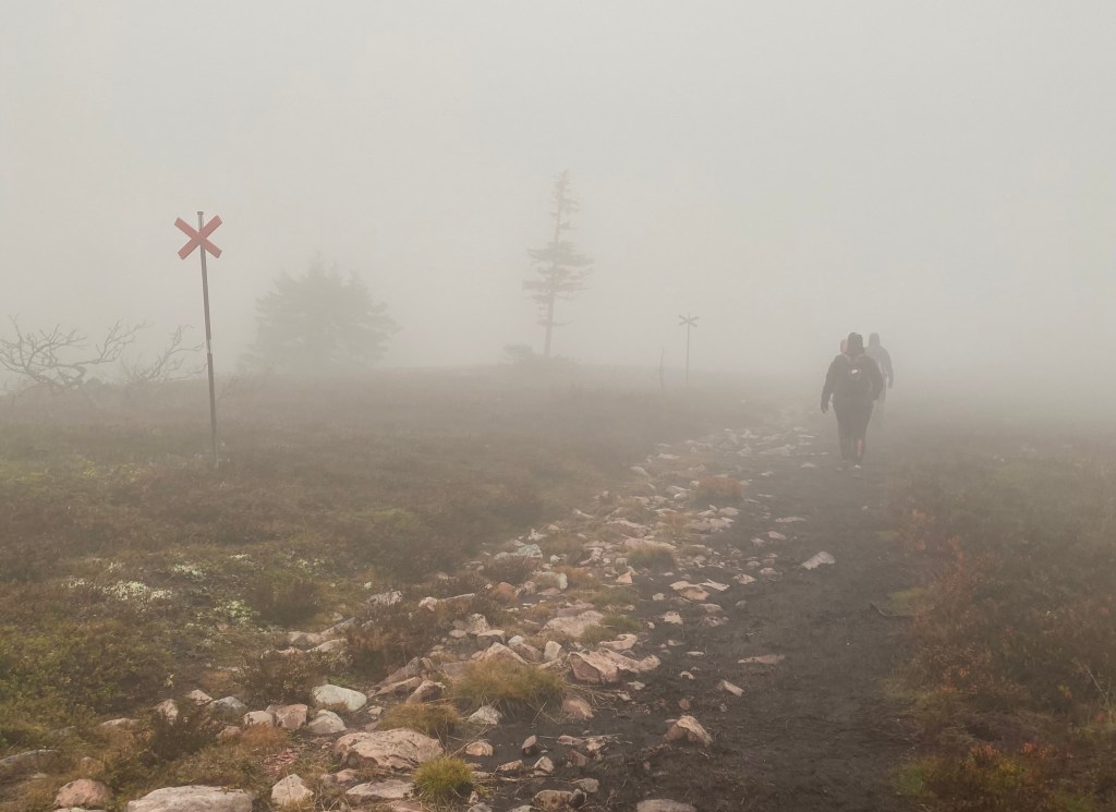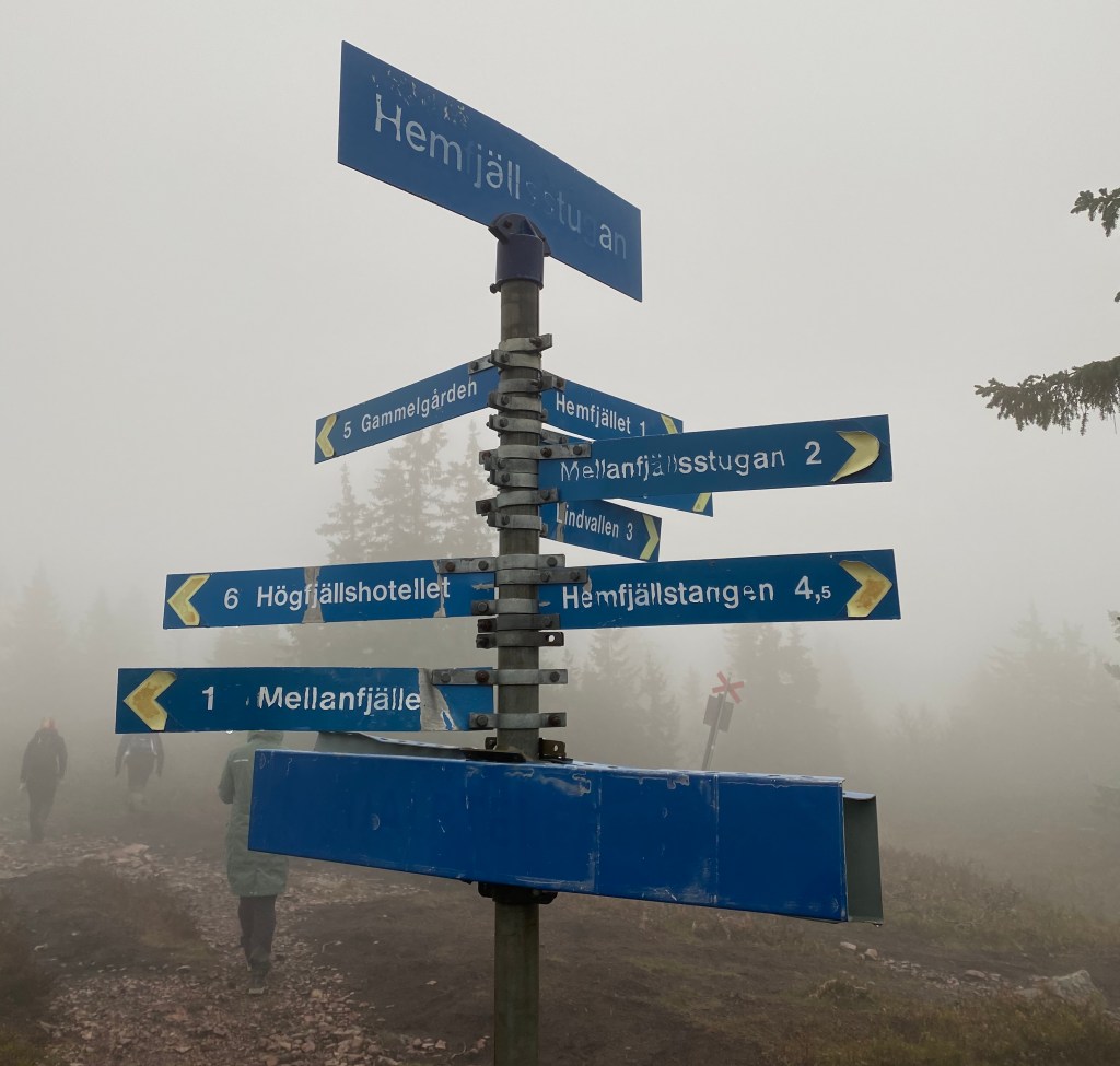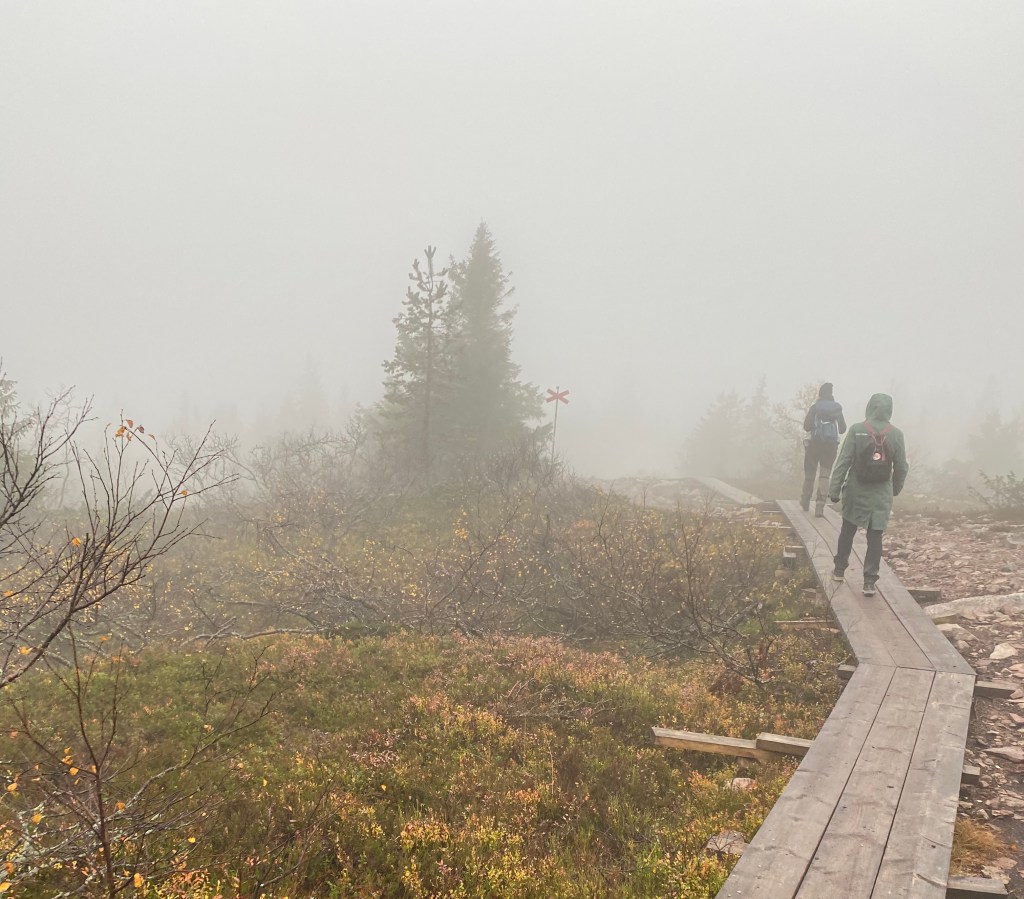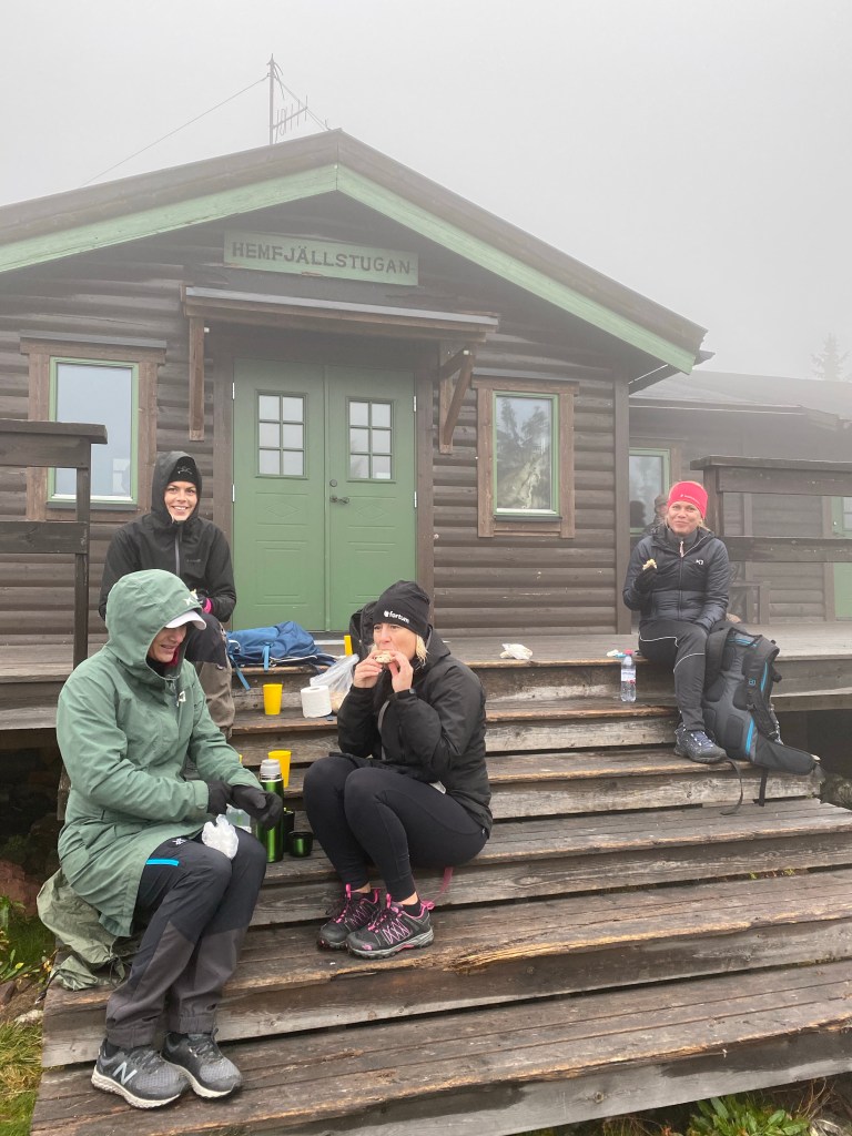 Vid Hemfjällsstugan blev det lunch och fikapaus. Vädret då? Solen såg vi inte mycket utav men det var vackert ändå. Det var ju väldigt dimmigt så vi såg som sagt inte många meter runtomkring men det är något otroligt vackert med den där dimvyn också.
