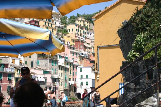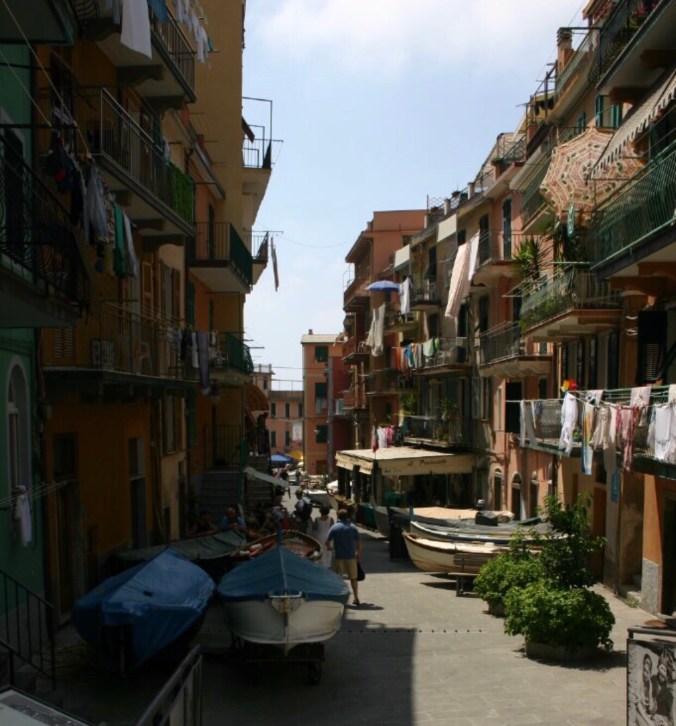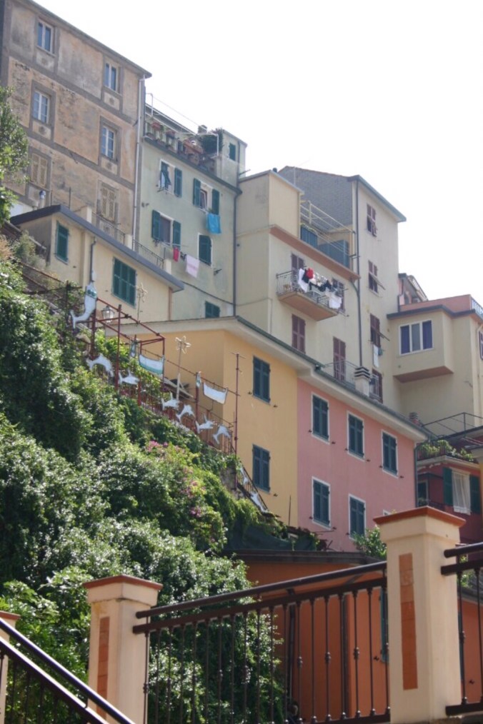De fem små byarna heter Monterosso al Mare, Vernazza, Corniglia, Manarola, Riomaggiore. Då vi var i Ligurien tog vi tåget från Rapallo till byn längst bort Riomaggiore. Där strosade vi runt och förundrades över hur man lyckas frakta mat och andra nödvändigheter till denna lilla by. Vi åt lunch och badade där. Sedan gick vi sträckan till nästa by Manarola, till fots längs vandringsleden. Där blev det paus för glass. Det finns flera mil vandringsled mellan byarna. Men tåg går det också bra att åka mellan byarna och det gjorde vi till Monterosso al Mare. Där hittade vi en fin sandstrand perfekt för en till badpaus. Annars är det ofta badmöjlighet vid klippor som gäller längs denna sträcka.