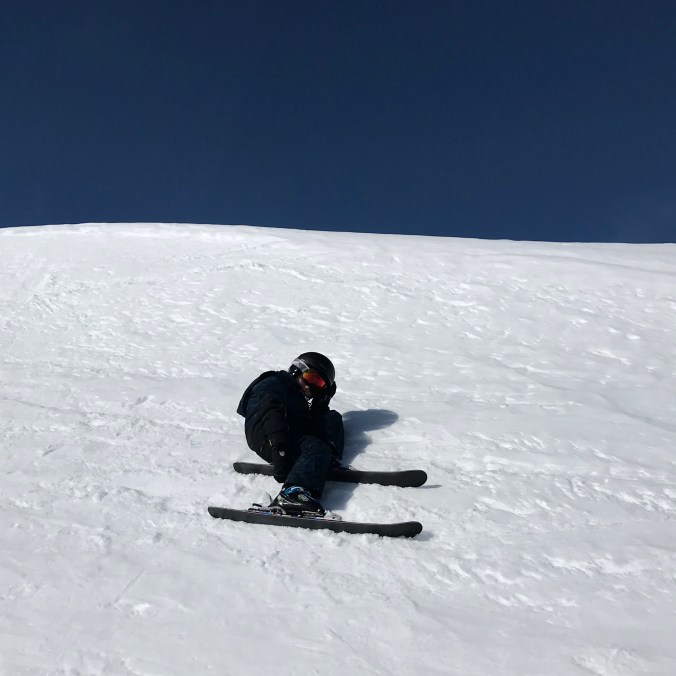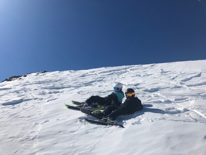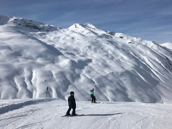 Här är vi på väg ner för en svart backe. Det ser faktiskt riktigt brant ut på bild. Men det gick hur bra som helst. Barnen susade ner med grym teknik. Bra jobbat skidläraren (pappan i familjen). 👏