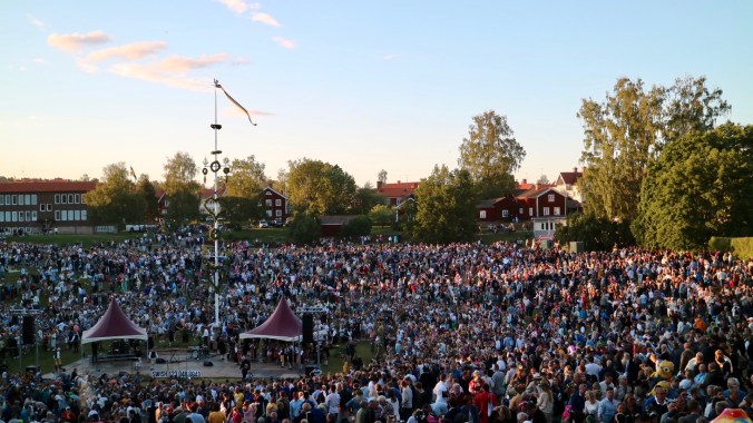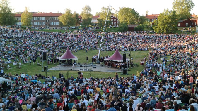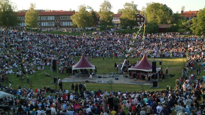 På eftermiddagen är det den lilla majstångsresningen vid hembygdsgårdarna i Leksand. Och senare på kvällen drar det stora firandet i Gropen igång. Man kan kolla in majstångsresningar hela dagen om man så vill. Vi valde firandet i Gropen. Till detta firande brukar det komma ca 20 000 – 30 000 personer. Galet många.