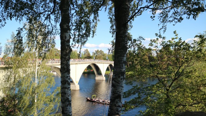 Kl. 19.00 är det kyrkrodd då anländer kyrkbåtarna vid brofästet. I kyrkbåtarna finns spelmännen och dekorationer till majstången. Jag lyckades fånga båtarna på bild uppe från caféet/restaurangen på udden. Så mycket människor, kolla bron! Och här syns också hjärtdekorationen som ska till majstången.