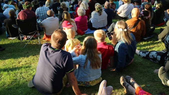 Sedan ska majstången resas. Publiken hejar på duktigt både genom att göra vågen och ropa Åhhh hej! på konferencierens uppmaning.