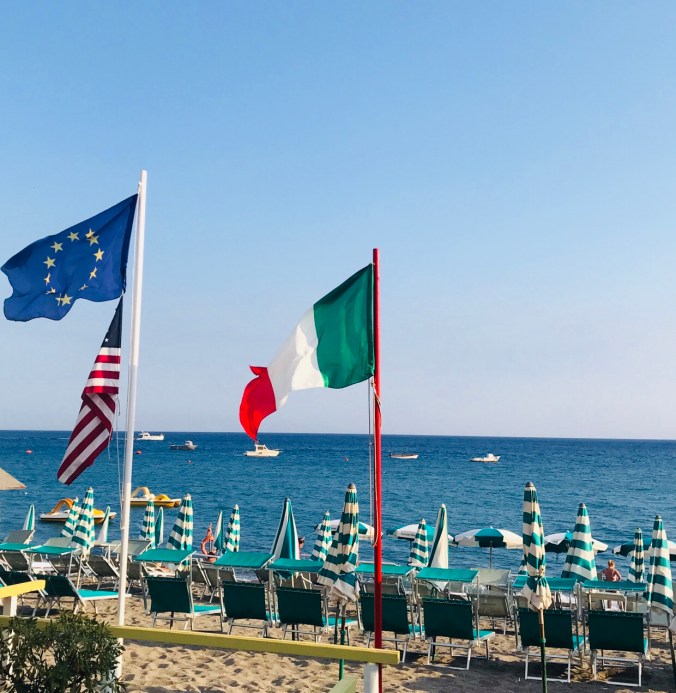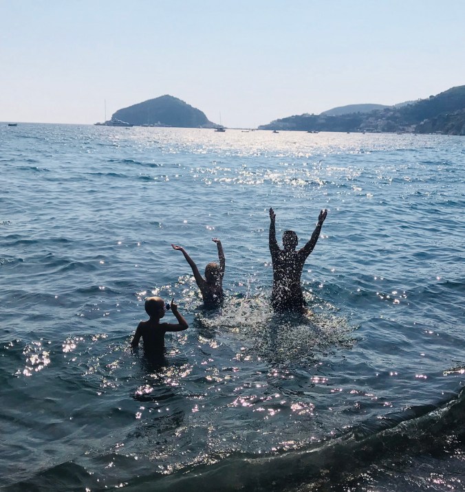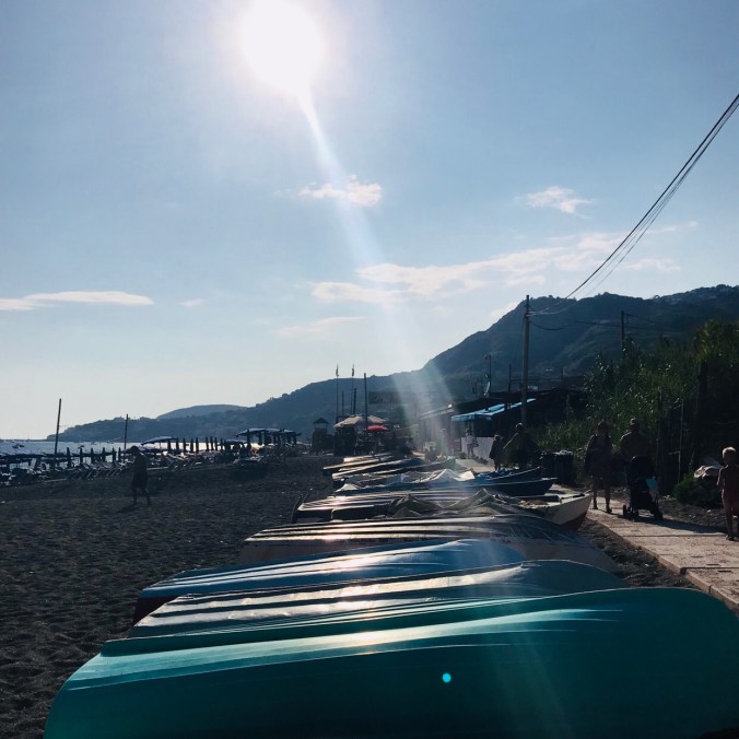 Det finns många och långa fina stränder på Ischia. Vi var vid stranden i centrum en dag och i övrigt längs vår jättelånga härliga strand i Maronti. Det är finkorniga stenständer och vattnet sådär härligt turkosblått. Det finns både privata (där man kan hyra solstol med parasoll) och allmänna (gratis) områden längs Marontistranden.